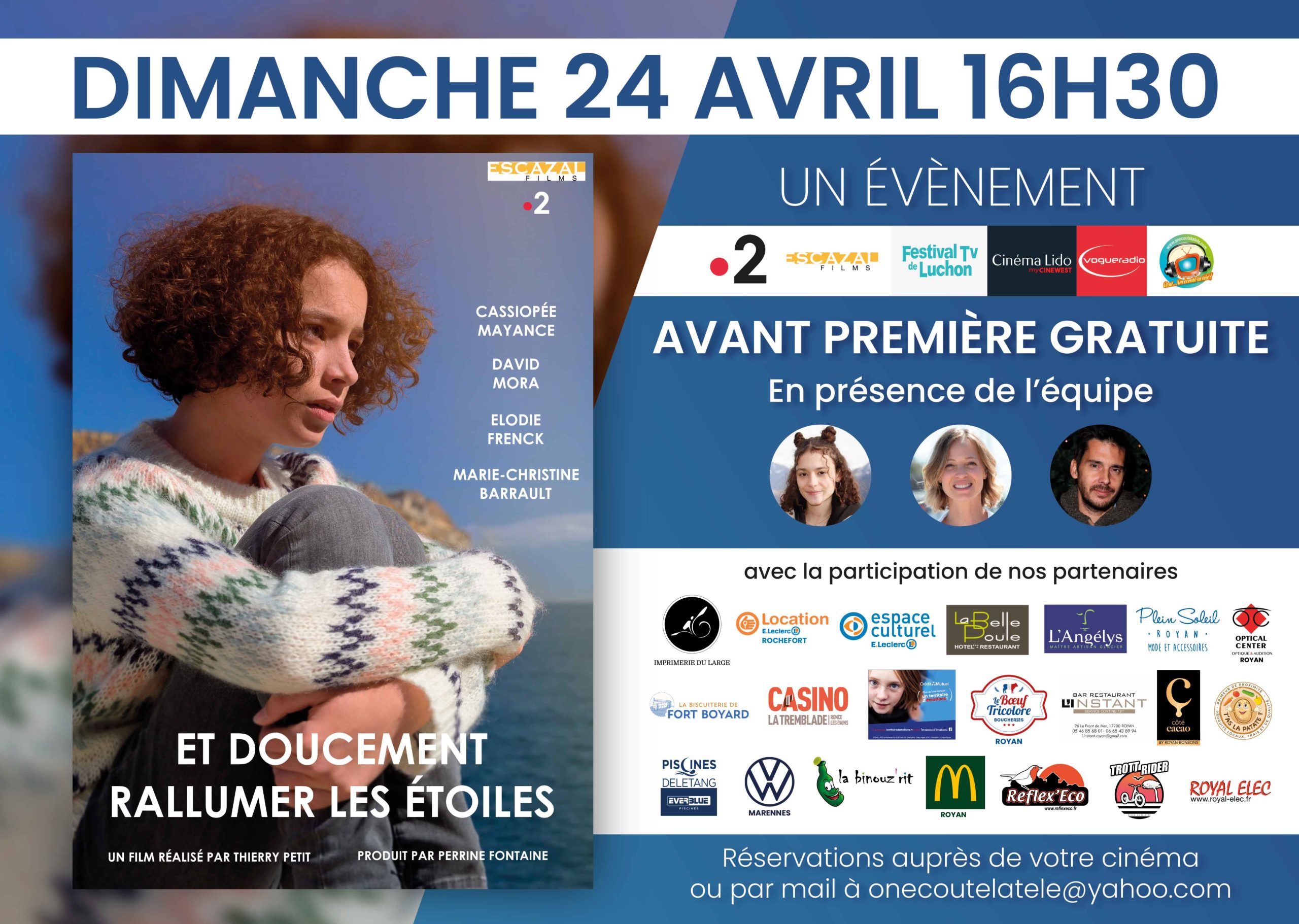 Alors rendez vous Dimanche 24 Avril à 14h au cinéma Apollo ciné 8 de Rochefort en présence de la productrice Perrine Fontaine, de la scénariste Lorène Delannoy, du réalisateur Thierry Petit et des acteurs David Mora (scènes de ménages), Elodie Frenck (les petits meurtres d’agatha christie), Alexandre Thibaut (une famille formidable) et de la jeune Cassiopée Mayance